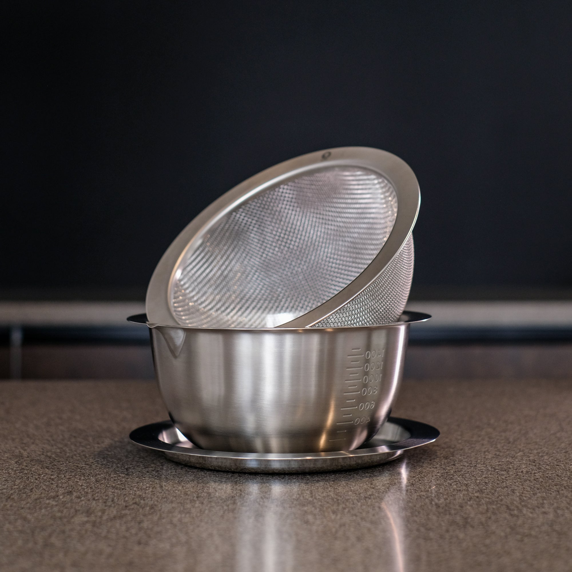 プロが使うザルとボウルのセット「フラットエッジ深型ボウルシリーズ」。